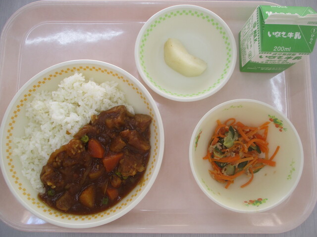 『ポークカレー、にんじんサラダ、なし、牛乳』