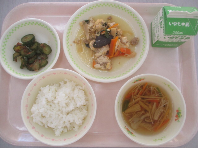 『ごはん、炒り豆腐、きゅうりのひたひた、きのこ汁、牛乳』