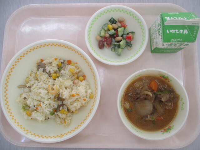 『エビときのこのピラフ、まめ豆サラダ、ハンガリアンシチュー、牛乳』