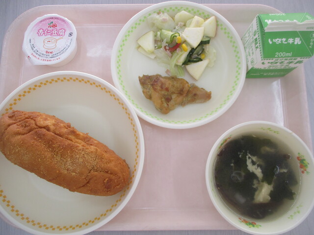 『揚げパン、スパイシーチキン、りんごのサラダ、中華スープ、杏仁豆腐、牛乳』