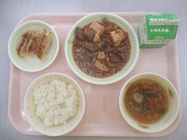 『ごはん、よくばりマーボー、蒸し餃子、春雨のスープ、牛乳』
