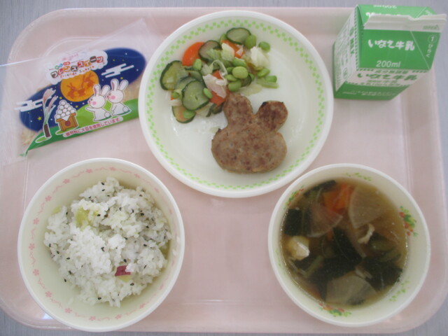 『さつまいもごはん、うさぎ型ハンバーグ、枝豆のサラダ、けんちん汁、お月見クレープ、牛乳』