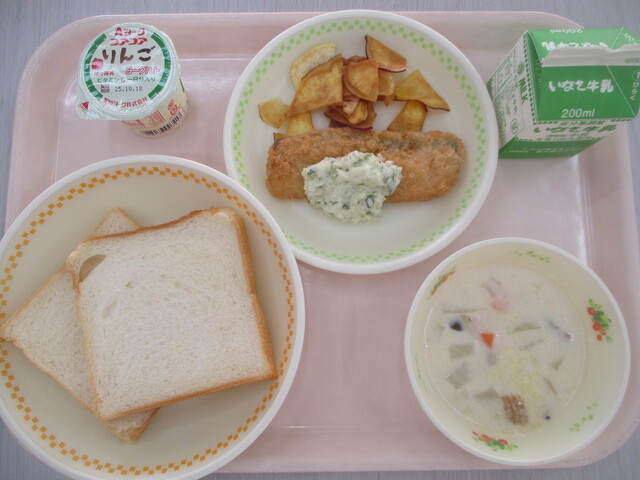 『食パン、サーモンフライ、タルタルソース、やさいチップス、秋野菜のチャウダー、りんごヨーグルト、牛乳』