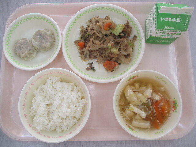 『ごはん、豚肉とれんこんのオイスターソース炒め、野沢菜まんじゅう、豆腐の中華スープ、牛乳』