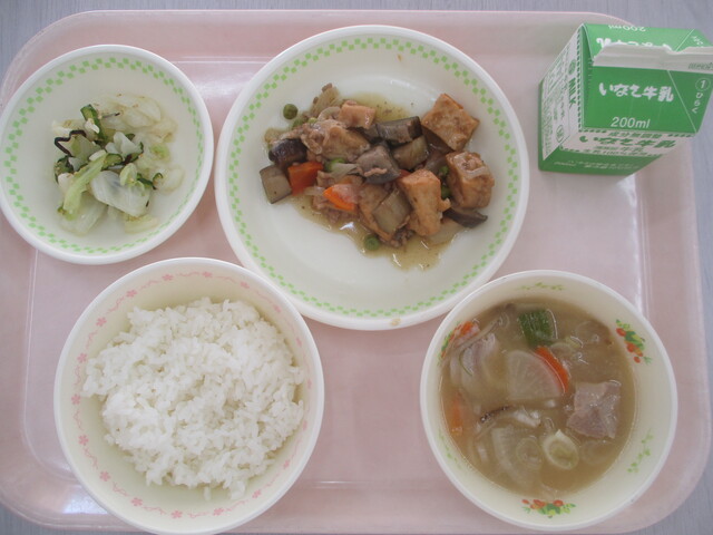 『ごはん、なすと厚揚げのそぼろ煮、キャベツの塩昆布和え、豚汁、牛乳』