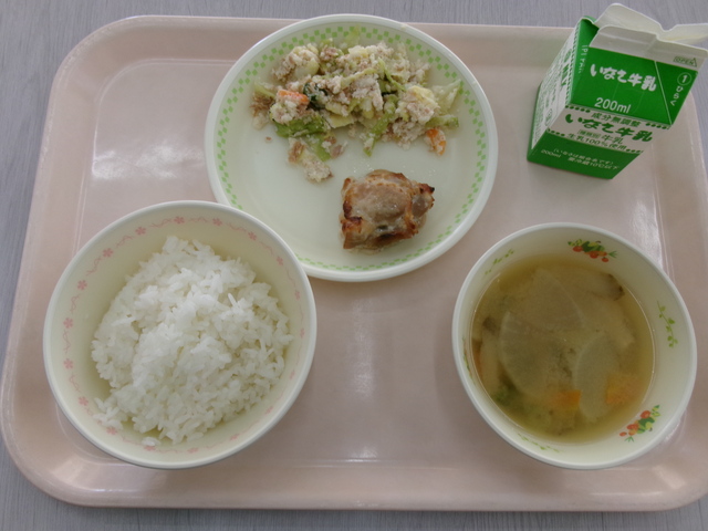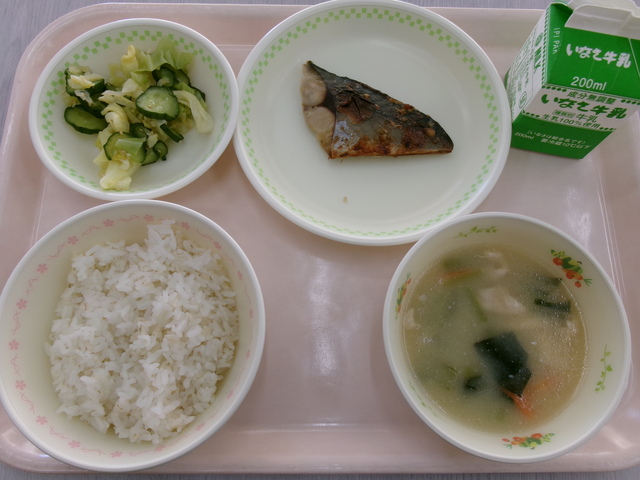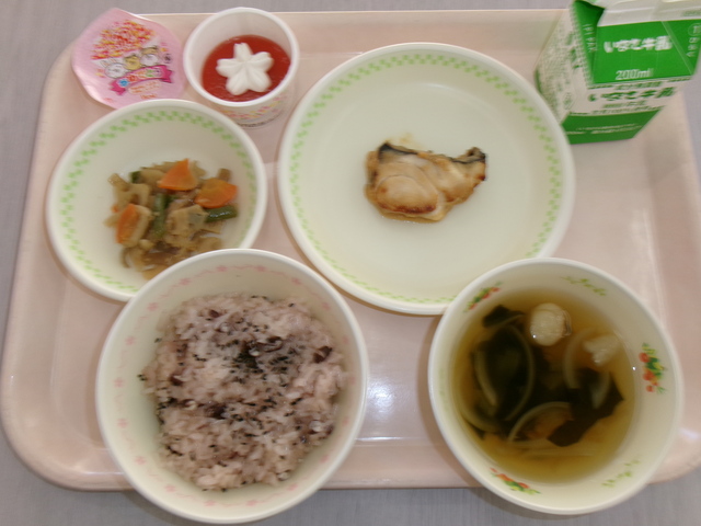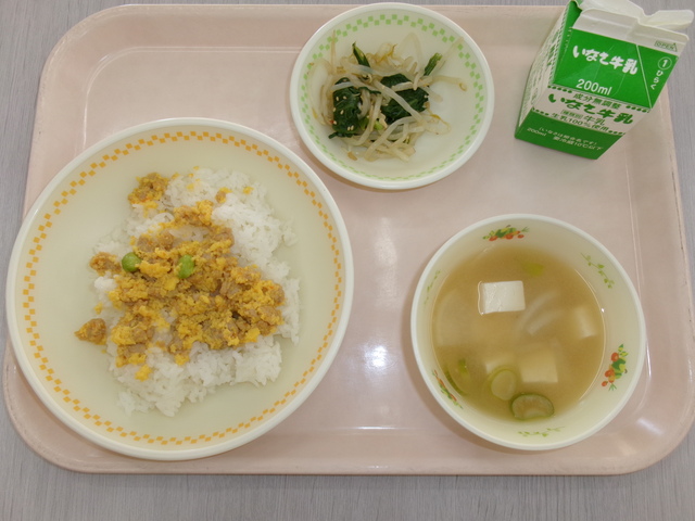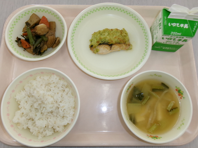 『ごはん、目鯛のずんだ焼き、たけのことあらめの煮物、切干大根のみそ汁、牛乳』