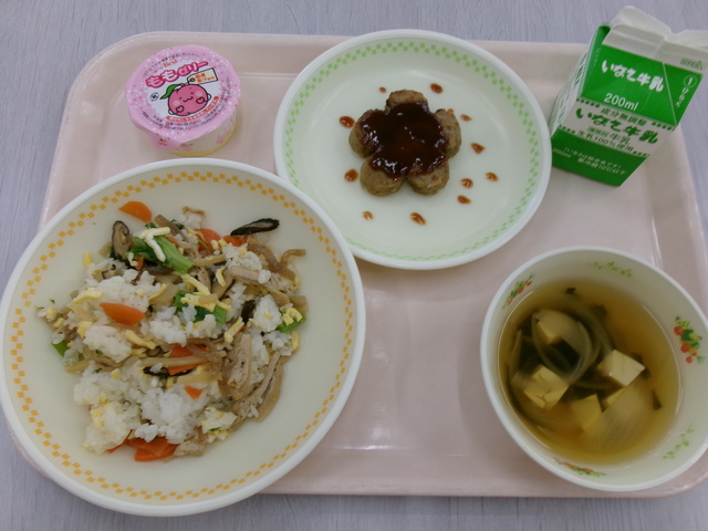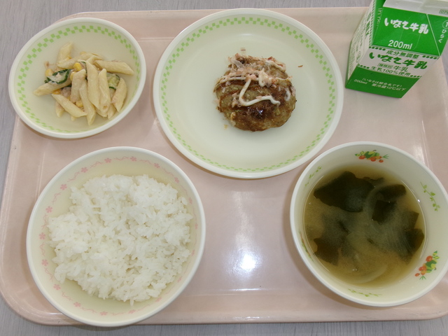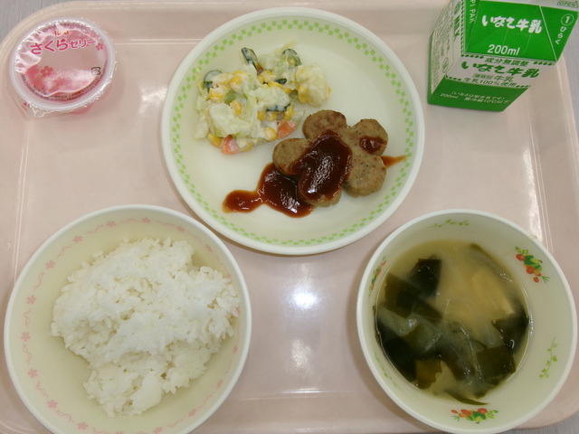 『ごはん、花型ハンバーグ、春キャベツ入りポテトサラダ、玉ねぎとわかめのみそ汁、牛乳、さくらゼリー』