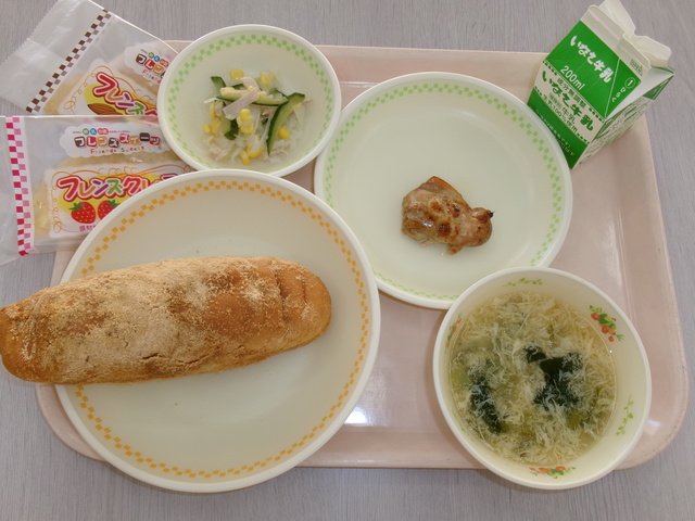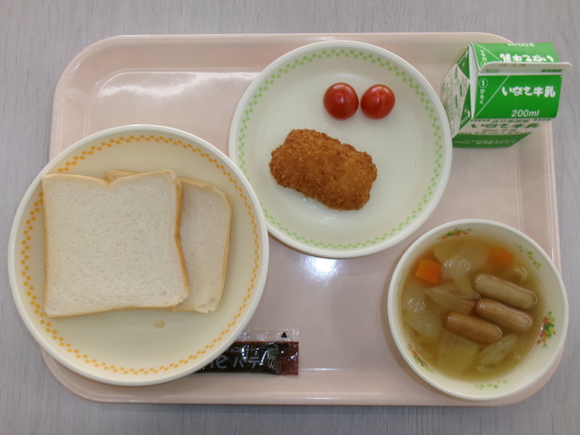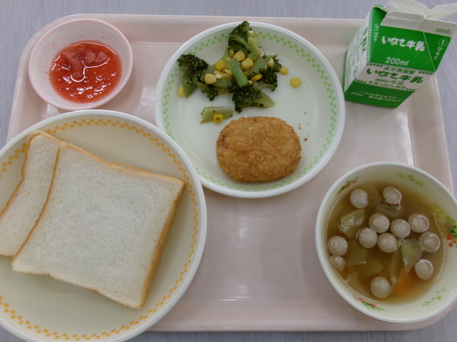 『食パン、手作りいちごジャム、ツナコロッケ、ブロッコリーとコーンのソテー、キャベツとウインナーのスープ、牛乳』