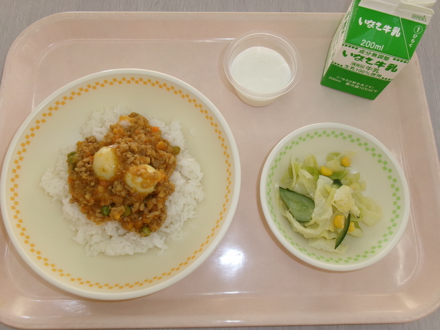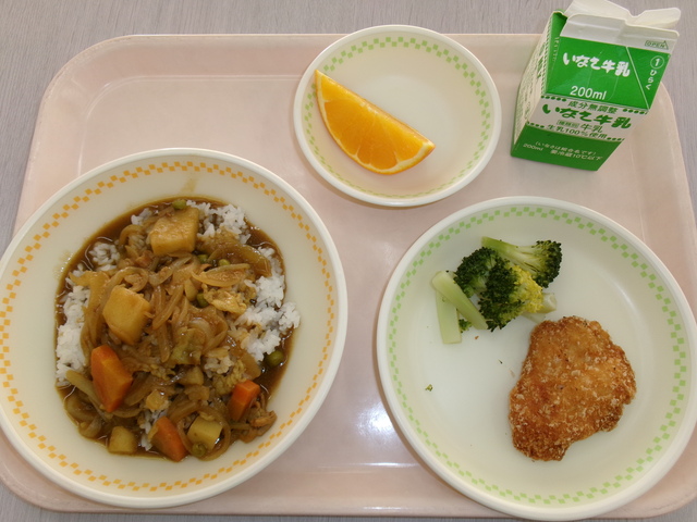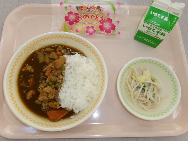『チキンカレー、春キャベツのパスタサラダ、牛乳、お祝いクレープ』