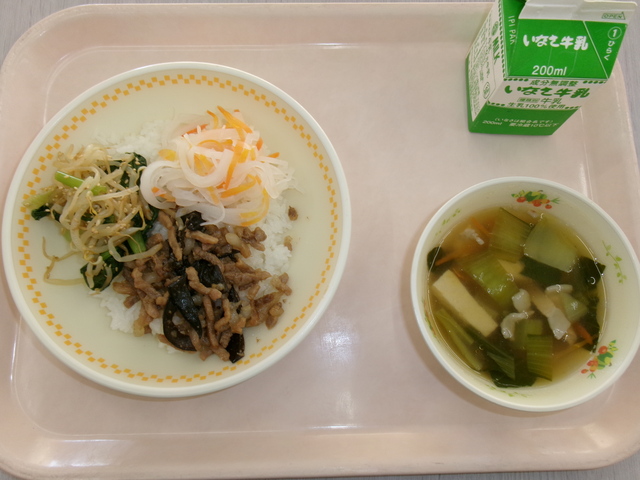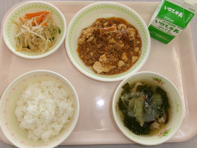 『ごはん、麻婆豆腐、春雨サラダ、チンゲン菜の中華スープ、牛乳』
