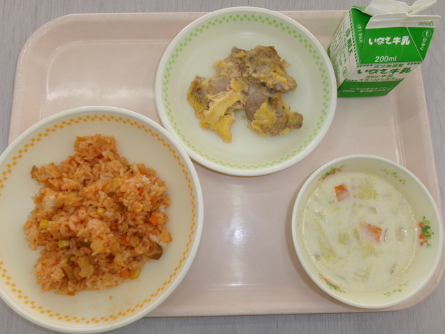 『ケチャップライス、ポークピカタ、野菜のミルクスープ、牛乳』