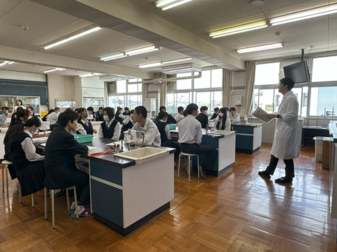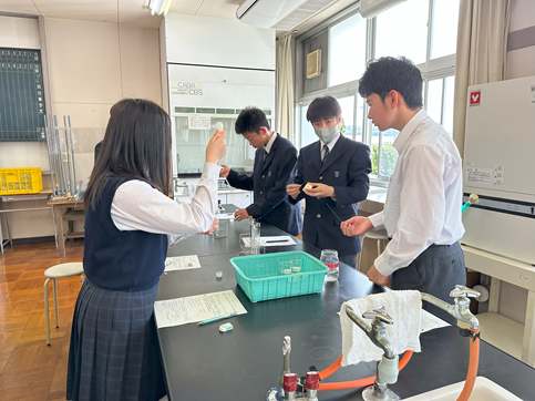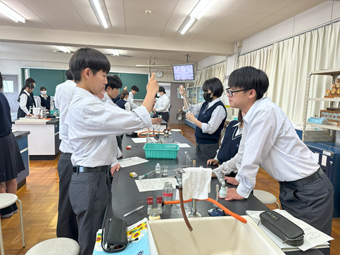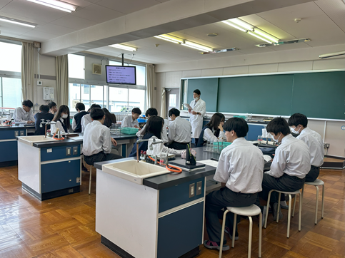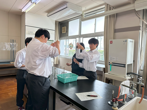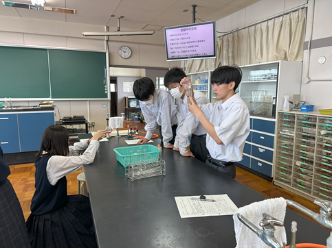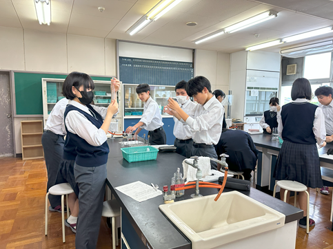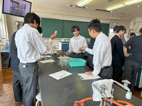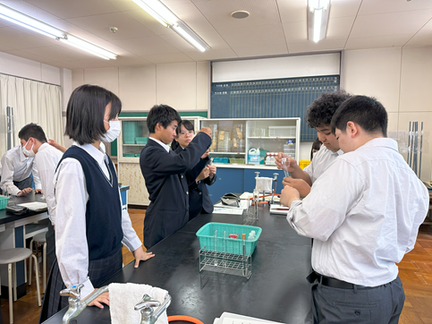 公開日 2025年06月03日 【生物基礎】酵素の性質 1年生の生物基礎の授業で「酵素の性質」の実験を行いました 肝臓に含まれるカタラーゼのはたらきや性質を調べるために、過酸化水素を水と酸素に分解する反応を観察しました 1年生は入学してから初めての実験だったため、教員と手順を確認しながら進めていきました 肝臓に過酸化水素水を加えると気体が発生したり、その気体に線香の火を近づけると炎を上げて燃えたり、生徒たちは驚いた様子で観察していました