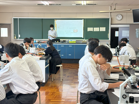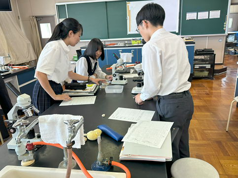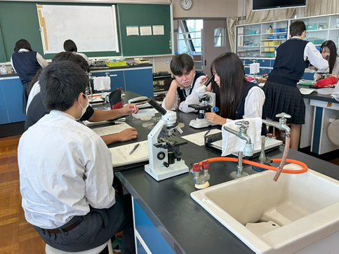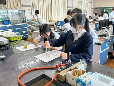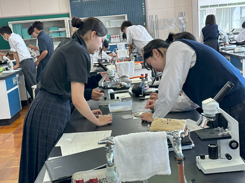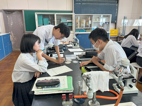 公開日 2025年09月12日 【科学と人間生活】微生物の観察 3年生の科学と人間生活の授業で先週準備した培地がどのように変化したか観察しました 空気に触れさせた培地と手で触れた培地の微生物(菌類や細菌類)の増え方に生徒たちはとても驚いていました その後、培地の微生物や学校の中庭の池の水や理科室で飼育しているミドリゾウリムシを顕微鏡で観察しました 池の水の微生物やミドリゾウリムシは動いている姿を見つけることができ、とても興味深そうに観察していました