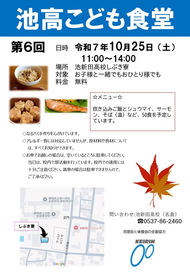 ようやく秋らしくなってきましたね。第6回池高こども食堂のお知らせです。