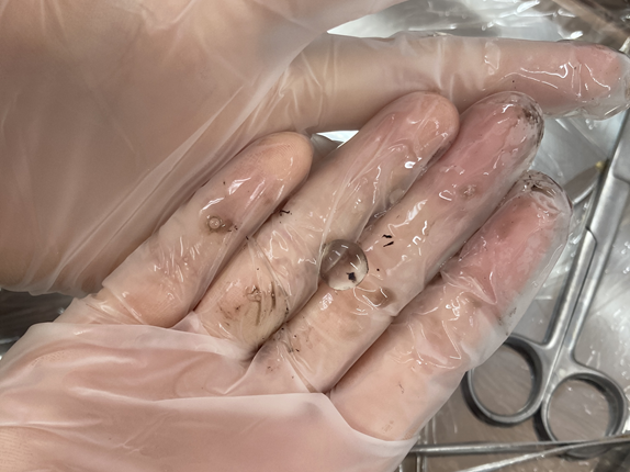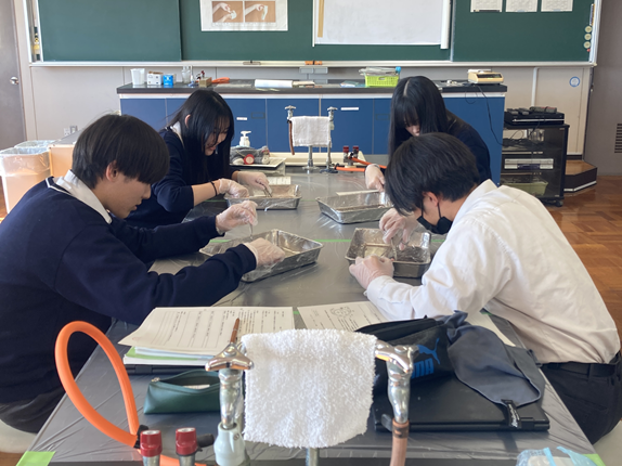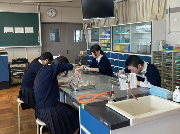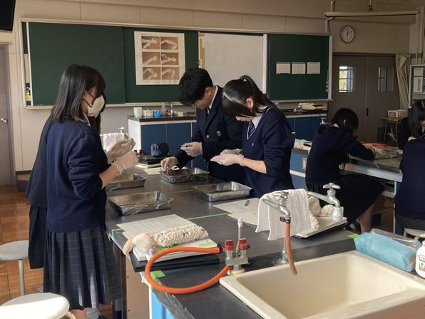 公開日 2026年01月14日 3年理系選択の生物で、豚の眼の解剖し、構造の観察や機能を確認しました。 眼球を目の当たりにして最初は気持ち悪がっていた生徒もいましたが、解剖していくうちに徐々に慣れ、しっかりと観察することが出来ました。 「見た目よりずっと硬い」「視神経が貝柱みたい」など、実物ならではの多くの発見があった貴重な時間になりました。