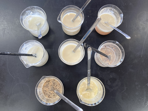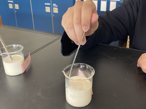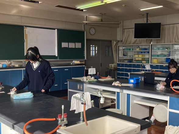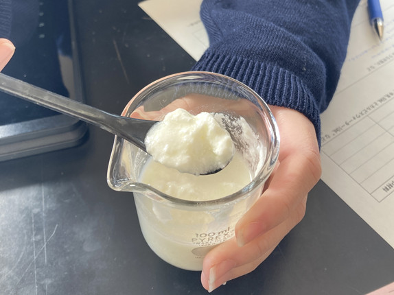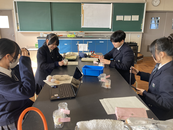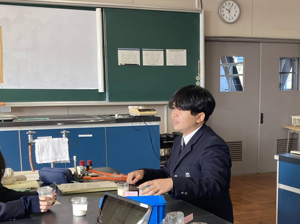 公開日 2026年01月15日 3年理系選択の生物基礎演習で、先日作ったヨーグルトが出来ているか結果を確認しました。 入れた物、作成手順、発酵温度が一人一人異なるため、ヨーグルト状に固まっている物、部分的に固まっているけれどもヨーグルトではなさそうな物、牛乳状のままさらさらしている物、強烈な臭いを放つ物など、結果も様々。材料と手順が同じであっても、37℃ではしっかり固まり4℃では全く固まらなかったりと、興味深かったです。 後日、作り方から結果考察をまとめて発表します。