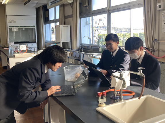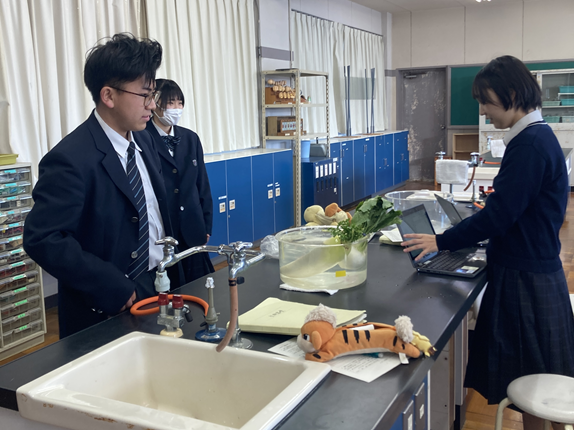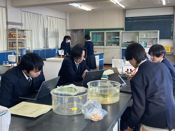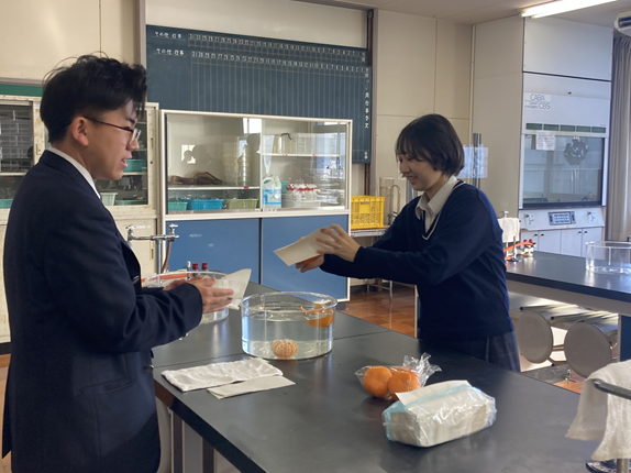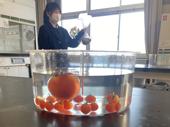 公開日 2026年01月22日 2年生の生物基礎演習で、水に浮く野菜と沈む野菜を調べる実験をしました。 用意された野菜・果物は、大根、かぶ、かぼちゃ、玉ねぎ、さつまいも、トマト、ミニトマト、りんご、みかん。切ったり皮を剥くと結果が変わるものもあり、生徒達は色々試しながら楽しそうに調べていました。 後半は浮くか沈むかの違いは何によって決まるのかを考察し、レポートを作成しました。