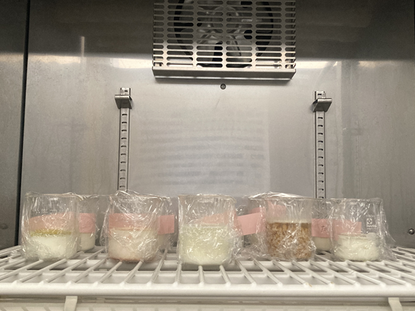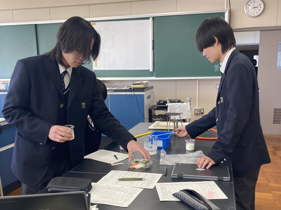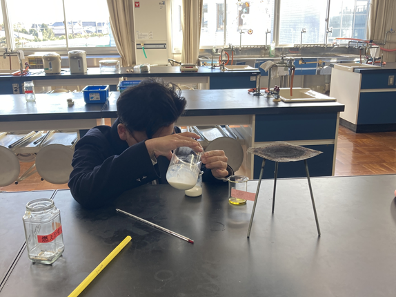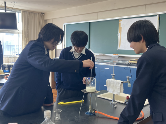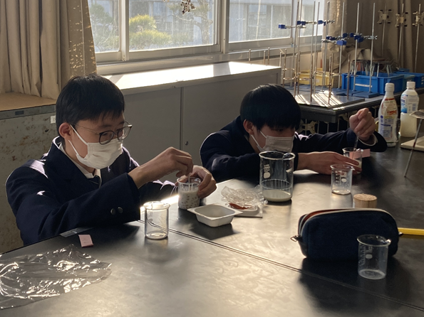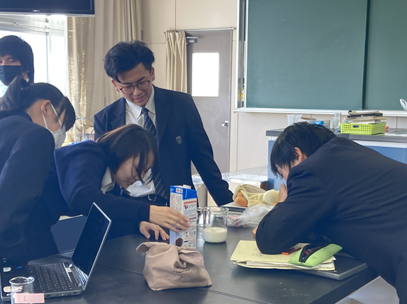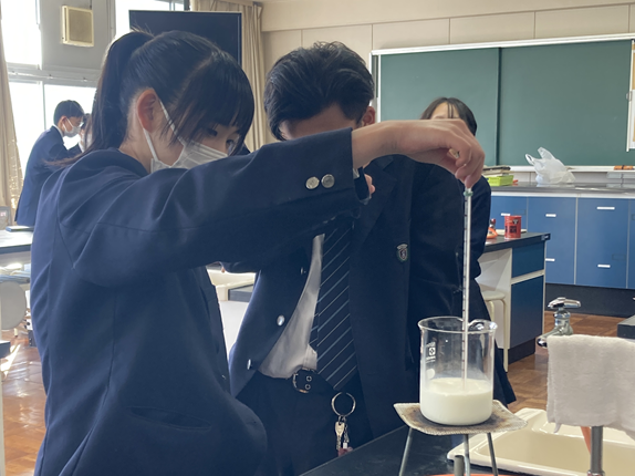 公開日 2026年02月05日 先月の3年生に続き、2年生の生物基礎演習でも牛乳にヨーグルト以外のものを入れてヨーグルトを作る実験を行いました。 今回は味噌や納豆、漬物、チーズなどの発酵食品や乳酸菌飲料のほか、オリーブオイルや生ハムを入れている生徒もいました。 どのような結果になるか、後日結果を確認するのが楽しみです。