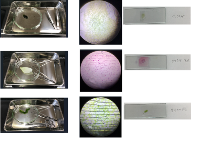 ピンセットや柄付針を使った細かい作業は難しく、顕微鏡でピントを合わせることも大変でしたが、ピントが合うと肉眼では見ることができない核や細胞壁、葉緑体、液胞を観察することができ、歓喜の声が上がっていました。