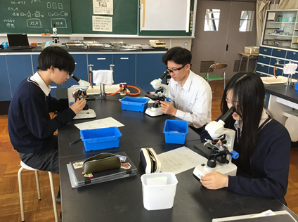 科学と人間生活と生物基礎の授業で、オオカナダモ(水草)・タマネギ(薄皮)・イシクラゲの細胞観察を行いました。