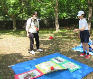 事前授業で作った的を使い、ターゲットボッチャをやりました。生徒たちは、自分の作った的に向かって、ボールを上手に投げることができました。