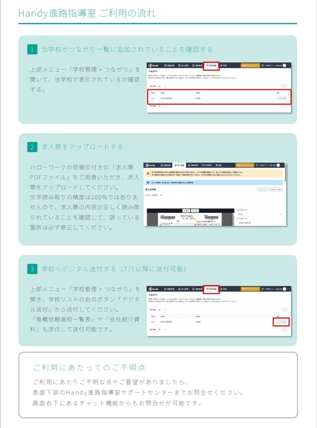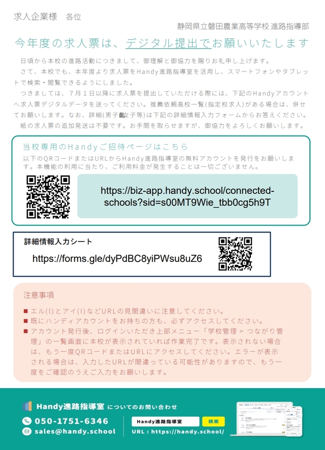 公開日 2025年06月13日 求人票を持ってきてくださる企業の皆様へ 求人票を持ってきてくださる企業の皆様へ 本校では、本年度より求人票をHandy進路指導室を活用し、スマートフォンやタブレットで検索・閲覧できるようにします。 恐れ入りますが、7月1日以降に持ってきてくださる求人票は、添付資料「求人票はデジタルで提出願います」を参考に、Handy進路指導室へル求人票データの入力をお願いします。