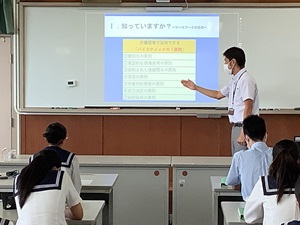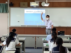 公開日 2025年09月10日 1年生(40名)は、デイサービス実習の事後指導の一環として、ラクラス見付施設長様を講師にお招きし、介護実習の振り返りに関する講義を受けました。生徒たちは、レクリエーションの意義や報告.相談.連絡の重要性について改めて学ぶことができました。