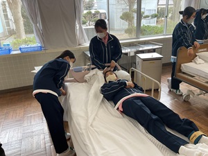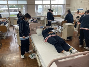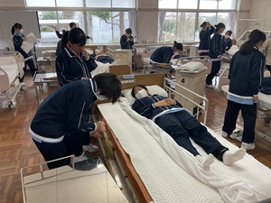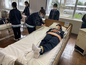 入学後、最初に学習したベッドメイキングや体位変換など、基本的な介護技術を応用し、利用者様にとって危険のない、安全で安心できる介護を行うために、一連の支援の流れを自分たちで考え、実践しました。