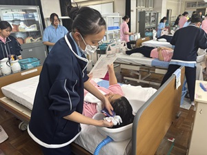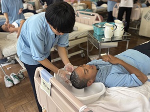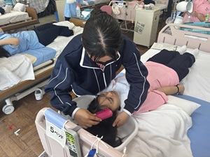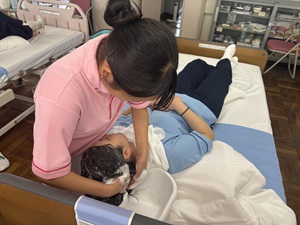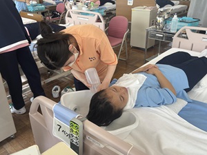 公開日 2026年04月21日 2年生の福祉科が洗髪実習を行いました🫧 今回は洗髪器を使用し、ベッド上での洗髪を行いました。 初めての洗髪で苦戦している様子でしたが、利用者様に心地よさ、快感を感じていただけるよう、介護者役の生徒たちは、頭皮のマッサージやお湯のかけ方、髪の拭き方など、一つ一つの動作を試行錯誤しながら行っていました。 たっぷりの泡で洗ってもらった生徒はとても気持ちよさそうでした💓