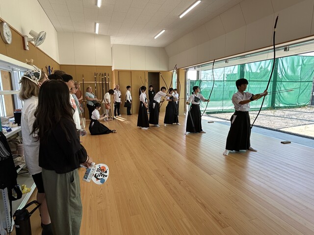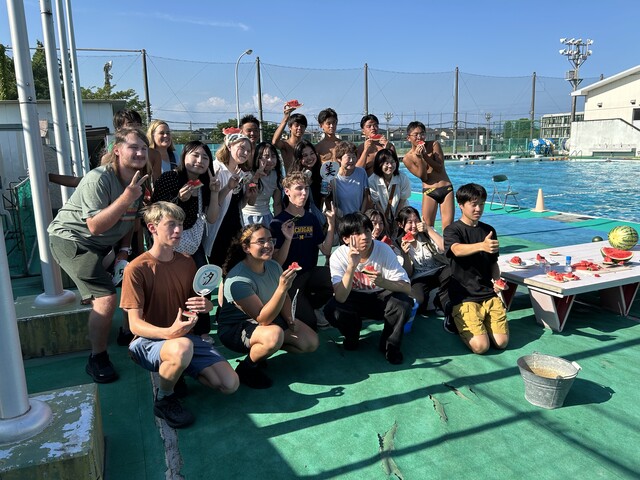 マウンテンビュー市から、マウンテンビュー高校、ロスアルトス高校の生徒と引率が磐南に来校しました。弓道部の練習の見学、水球部でスイカ割りをやらせていただきました。