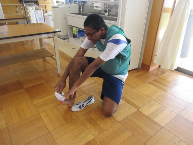 9月の保健では妊婦体験を行いました。歩く、座る、靴下の着脱等を体験し、身軽に動けず苦戦している様子が見られました。また、3カ月、6カ月、8カ月の子宮や赤ちゃんの模型を使い、胎児の成長過程についても学びました。