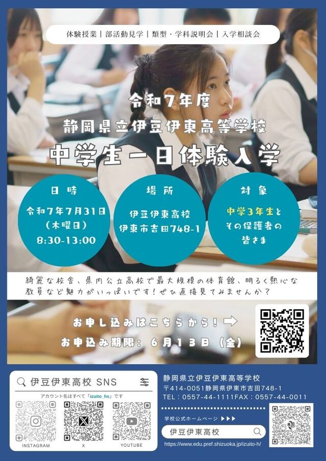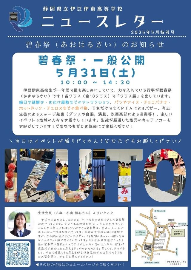 公開日 2025年05月23日 更新日 2025年05月23日 本校では、中学生やその保護者の方、地域の皆様に「伊豆伊東高校の魅力」を知っていただくためにニュースレターを発行しています。今回は「碧春祭(あおはるさい)」特集です!5月31日(土)10:00~14:30が一般公開ですので、どなたでもお気軽にお越しください! ニュースレター2号はこちら バックナンバー ニュースレター1号
