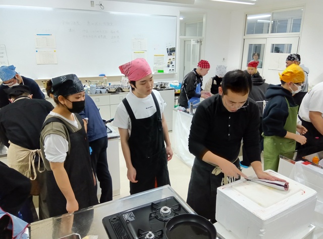 本日は、伊豆・いとう地魚王国の福田様、伊東市役所産業課の近持様、山田様にお越しいただき、魚のおろし方教室を実施しました。日頃、魚をおろす機会のある人もない人もいると思いますが、多くの仲間と一緒に調理する機会はなかなかありませんよね。