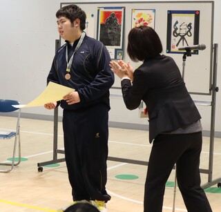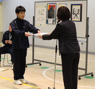 令和7年度第32回全国特別支援学校文化祭において加藤 汰一さん(2年生)の書道の作品「楽」が全国展において優秀賞に選ばれ、全国特別支援学校文化連盟から賞状とメダルが授与されました。