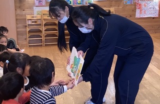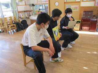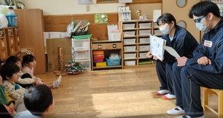 生徒たちは、園児の皆さんに喜んでもらえるよう、それぞれの年齢に合わせた本を自分たちで選定し、繰り返し読み聞かせの練習を重ねてきました。 当日は3歳、4歳、5歳の3つのグループに分かれて実施すると、園児たちが、身を乗り出して聞いてくれるなどとても良い反応が見られました。教室は終始和やかで温かい雰囲気に包まれました。