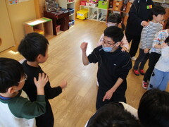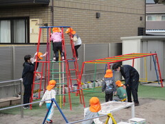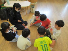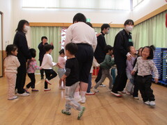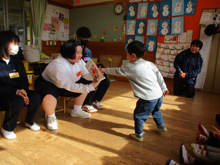 読み聞かせの後は、「電車じゃんけん」をして大盛り上がり!その後は園庭へ出て、一緒に遊具で遊んだり、走り回ったりと、楽しい時間を過ごすことができました。