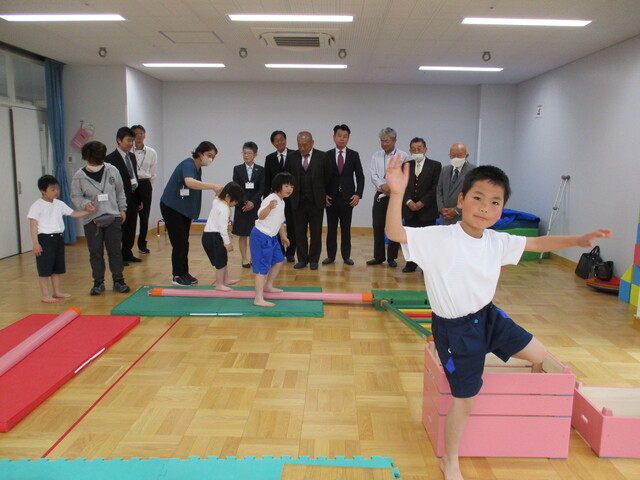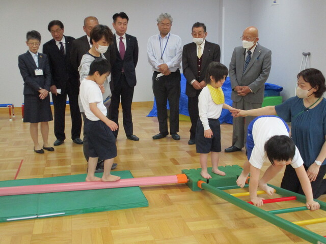 公開日 2025年05月12日 伊豆中央ロータリークラブさんより、巧技台をいただきました。 贈呈式に出席した小学部2年生の児童は「ありがとうございます!」とお礼を伝えた後、「はやくあそびたい!」とワクワク・・・ ロータリークラブの会員様方の見守る中、さっそく遊ばせていただきました。児童はみんな自分から身体を動かしていました。 伊豆中央ロータリークラブさんからは毎年教具を寄付していただいています。ありがとうございます。