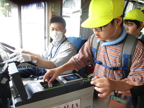 伊豆長岡のまんじゅうの学習では、タブレットを使って学校から柳月、黒柳までのルートを調べたり、バスの乗り方の練習を行ったりしました。伊豆長岡の校外学習当日は、マナーを守って静かに乗り、運賃箱を見て、お金を入れる姿が見られました。