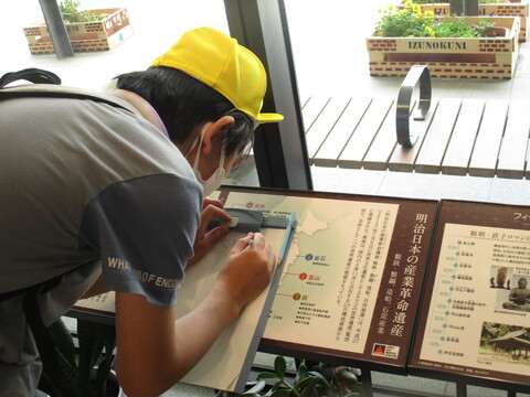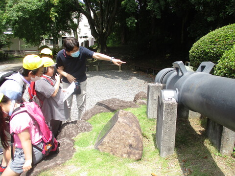 反射炉の学習では、反射炉についてのこと、反射炉で作っていた物について学習をしました。校外学習当日は、ガイダンスセンターで上映されている反射炉についての映像を集中してじっくり見たり、いくつか置いてある大砲を見つけて「大砲があるよ。」と教えてくれたりする姿が見られました。