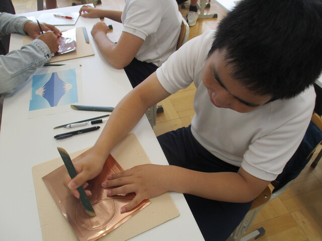 中学部2年生は、富士山をモチーフに銅板へら出しを行いました。県板金工業組合技能士会から講師の方々が来校され、道具の使い方、表現の仕方等を丁寧に教えてくださいました。