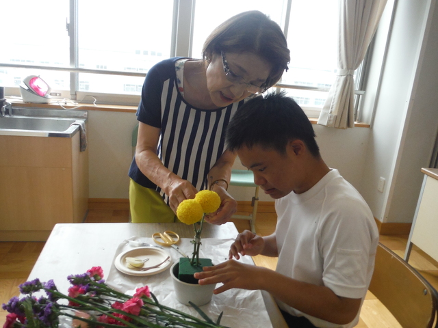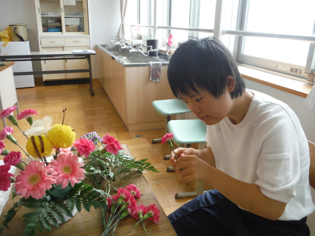 中学部1年生は、フラワーアレンジメントを行いました。県フラワー技能士会から講師の方々が来校され、花の扱い方や挿し方等を分かりやすく教えてくださいました。