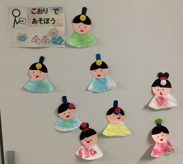 公開日 2025年09月02日 色水を凍らせて赤や青、緑などの氷を作り、コーヒーフィルターの上で滑らせて色を付けたり、にじませたりしてカラフルで、優しく淡い仕上がりのにじみ絵を作りました。7月の七夕に合わせて、色を付けたコーヒーフィルターを着物に見立て、画用紙で作った顔に目と口のシールを貼って自分だけの織姫、彦星を作りました。