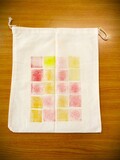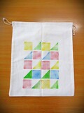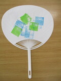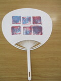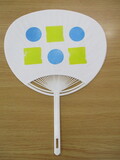 〇△▢のスタンプで、うちわと巾着袋に模様を描きました。