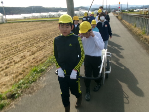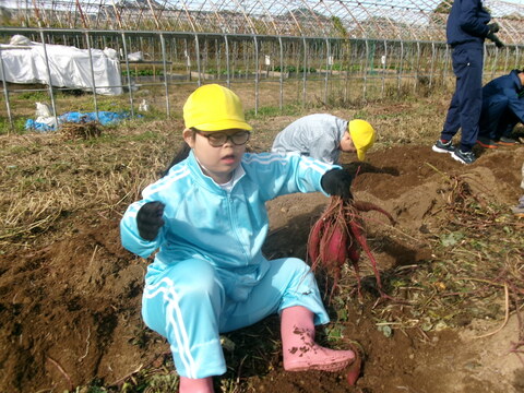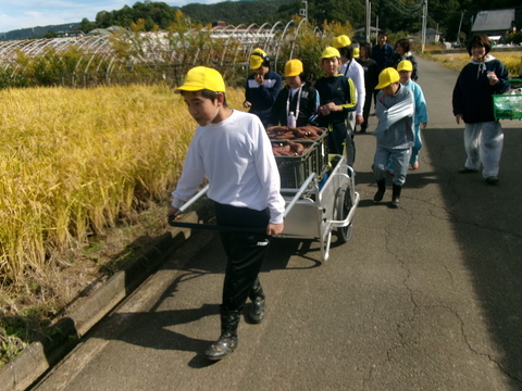 うねから少し頭をのぞかせているさつまいもを見つけると、両手でゴリゴリと土を掘り深めます。すると、「あったー。あったー。わーたくさんついてるー。」5~6個のさつまいもが連なって掘り出されました。収穫したさつまいもをコンテナに入れ、台車に乗せ、学校までみんなで交代しながら運びました。