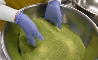 毎月実施している、「ちゃっぴー給食」の日でした。今日は、揚げたてのコッペパンに、「県内産の抹茶」と「きび糖」を混ぜて作った抹茶シュガーをまぶしました。抹茶には苦みがありますが、砂糖を混ぜると食べやすくなり、こどもたちにも好評でした。さらにこぼれた抹茶シュガーを指でつまんでおいしそうに食べているこどもたちもいました。