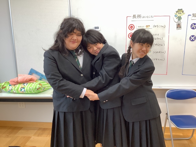 クラスを越えたグループを作り、一人ずつ前に出て、その友だちのいいところを伝えました。生徒達は友だちのことをよく見ていました。そして、自分では気づいていない、良いところを、友だちから伝えられると、照れ笑いがこぼれていました。
