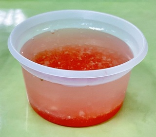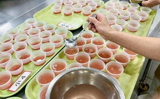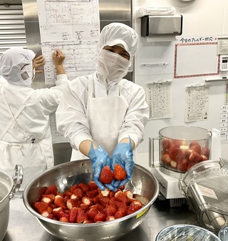 デザートには地元でとれた旬の紅ほっぺを使い、調理員さんがゼリーを作ってくれました。大きくて香りのよい真っ赤な紅ほっぺは、ミキサーにかけてしまうのがもったいない程の立派ないちごでした。この香りをしっかりゼリーの中に閉じ込めようと、調理員さんがやさしく丁寧に作っていました。