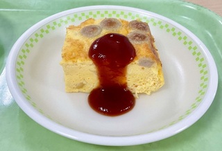 ウインナーとじゃが芋が入った、ふっくらオープンオムレツに、ほんのり甘いケチャップソースをかけたメニューです。いつもは、ケチャップソースを提供していないのですが、今日は調理員さん手作りのソースをつけてみました。ケチャップソースを気に入ってくれたこどもたちがたくさんいて、卵焼きの食べ具合がいつもよりも良く、ケチャップソースの効果を感じました。残食がとても少なかったです。