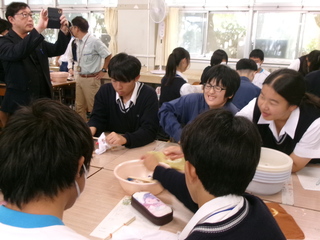 10月28日に田方農業高等学校ライフデザイン科フードコースの3年生と伊豆田方分校3年生が交流及び共同学習を行いました。今回は「田農産さつまいものいももちもみたらしあん」作りに取り組みました。