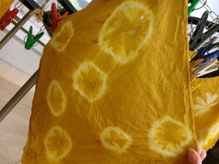 マリーゴールドの花殻を染料として使い、布にビー玉や木の切れ端をくるんで、染め上げました。